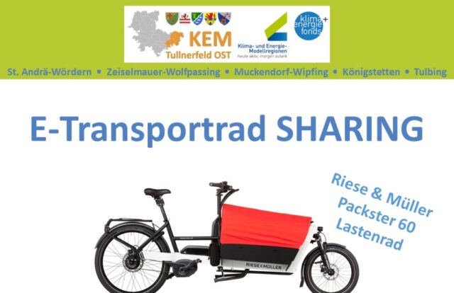 Transportrad-Sharing: Multifunktionaler PKW-Ersatz in der KEM Tullnerfeld OST Einreichende Institution: KEM Tullnerfeld OST Jahr: 2025 Bundesland: Niederösterreich umgesetztes oder in der Umsetzung gesichertes Projekt im Bereich Gebietskörperschaft (Gemeinde, Stadt, Bezirk, Region, Bundesland) 2025